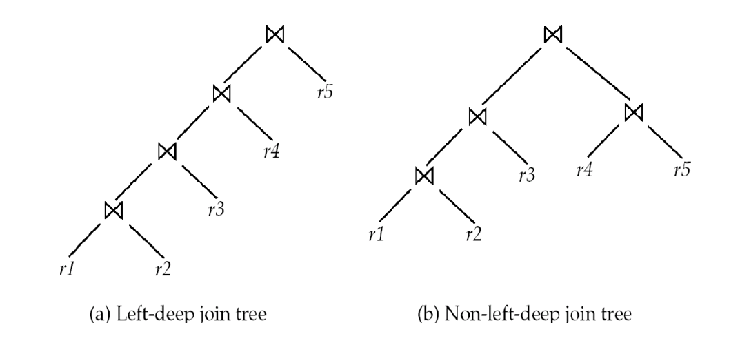- E.g. in left deep join trees, the right hand side input for each join is always a relation, not the result of an intermediate join.