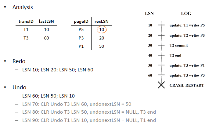 - Analysis - Reconstruct dirty page table and active transaction table