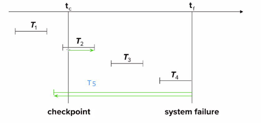 - T5 starts before checkpoint and is incomplete as failure