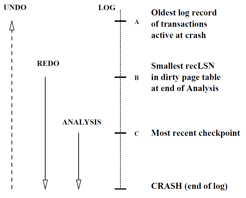 - Redo - Repeats all actions, starting from an appropriate checkpoint in the log (first entry in DIRTY PAGES TABLE), and restores the database state to what it was at the time of the crash (re-writes).